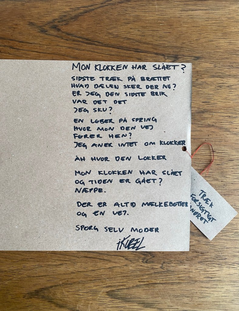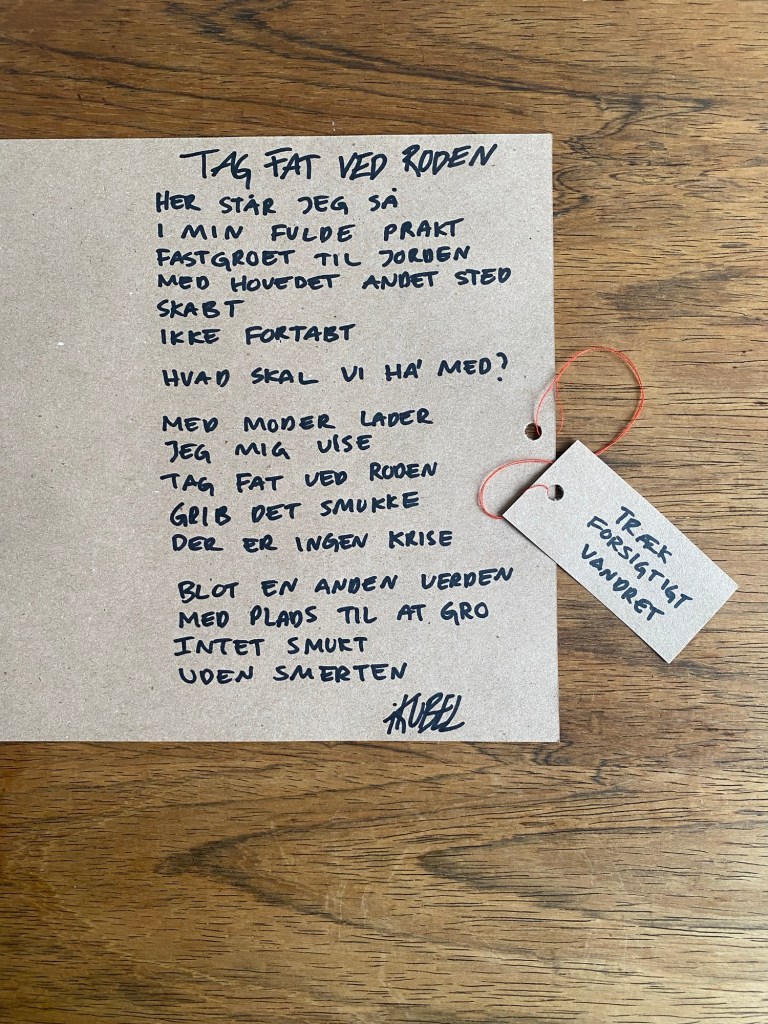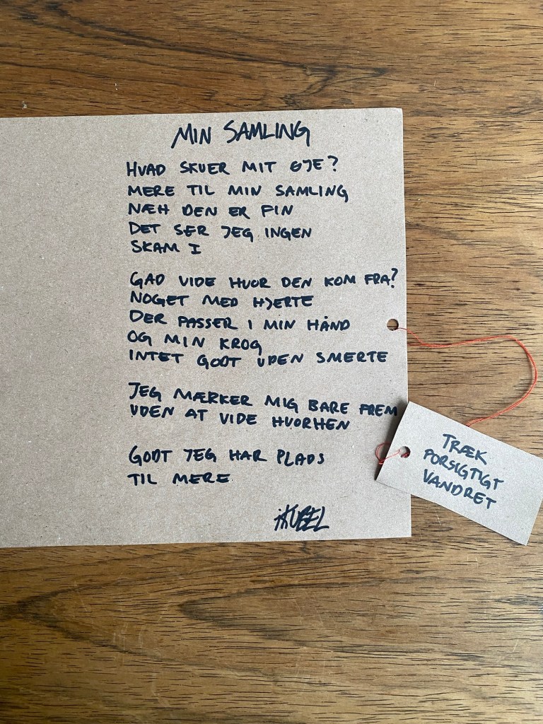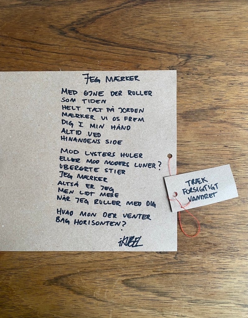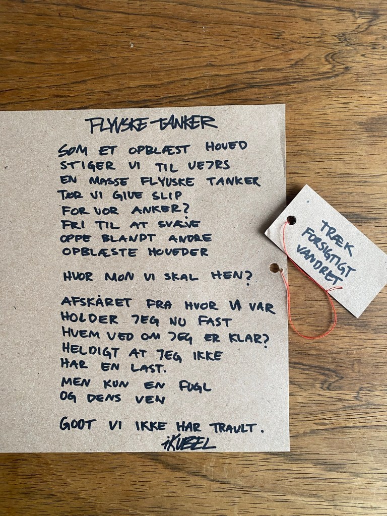 Værket er lavet af resttræ fra jem & fix, tekstil fra genbrug & er forsejlet m. epoxy og lak. Der medfører et håndskreven digt, der trækkes ud af værket.