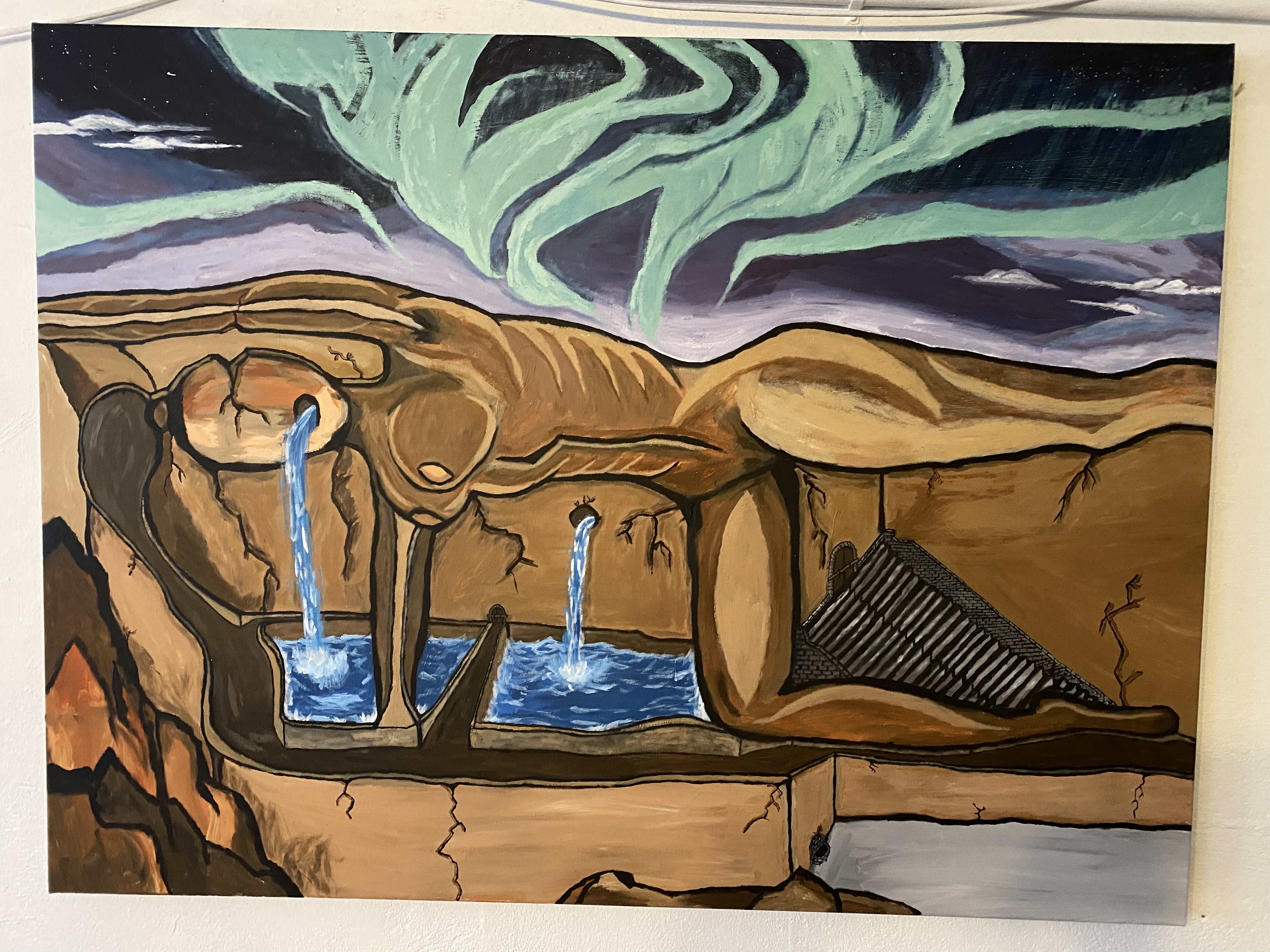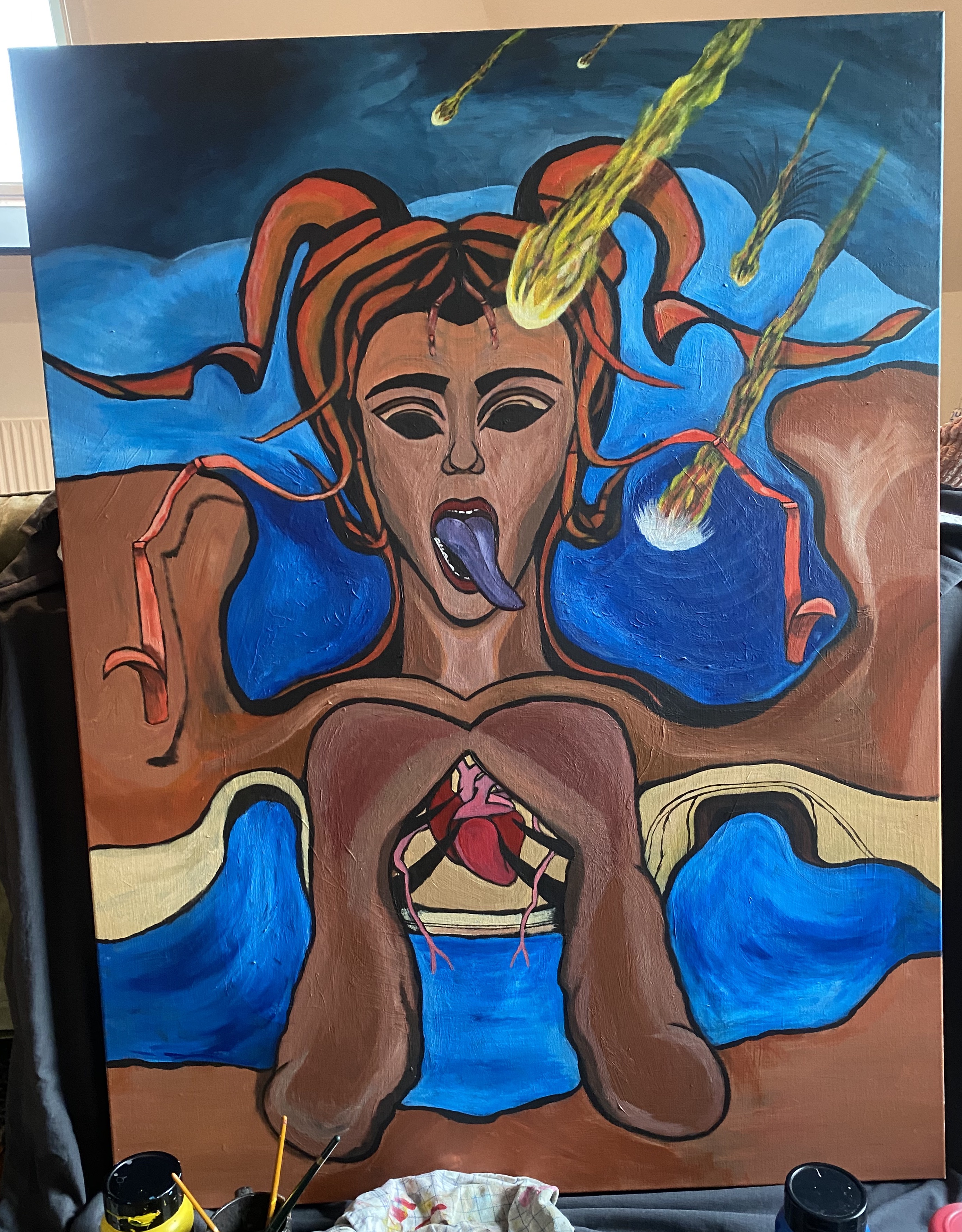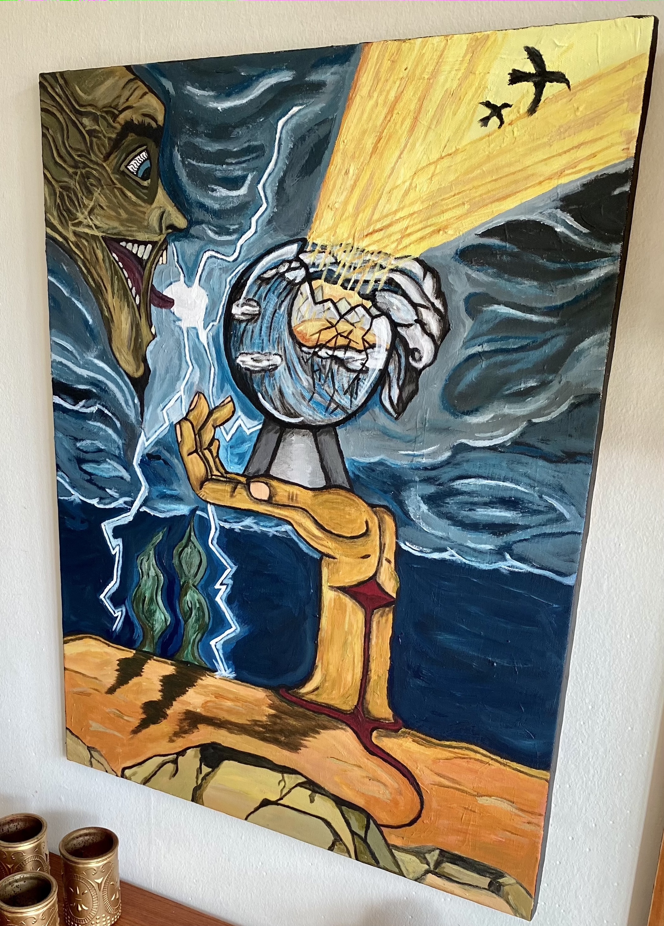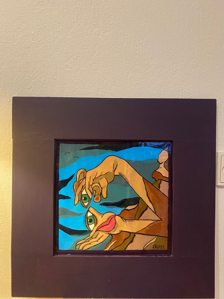Billederne til venstre er en serie jeg pt. arbejder på at få færdiggjort så den kan blive udstillet. De er inspirerede af mine motiver ovenfor, men i stedet for at male på lærreder (alle lærredsbilleder ovenfor, er lærreder jeg har haft brugt flere gange) er det malet på lærredsvævede tekstiler fra genbrug. Rammerne er lavet af resttræ fra Bauhaus og Jem & fix. Lærredet er slutteligt blevet epoxybehandlet. Billederne her er ligeså meget en holdning og attitude, som det er et værk der skal skabe refleksion og omtanke for samfundet, relationer og vores verden.
